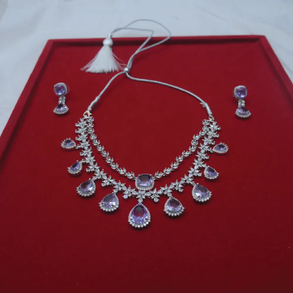 Experience the epitome of grandeur with the magnificent Dukhsan Overseas AD Necklace Set from Designer Collection 03. This is not just a piece of jewelry; it is a wearable piece of art designed to make you feel like absolute royalty. With its intricate floral motifs interlocked with brilliant American Diamonds, this heavy-look necklace set is the crowning glory for a majestic bridal trousseau or a lavish festive lehenga. It is guaranteed to leave an unforgettable impression. 👑✨